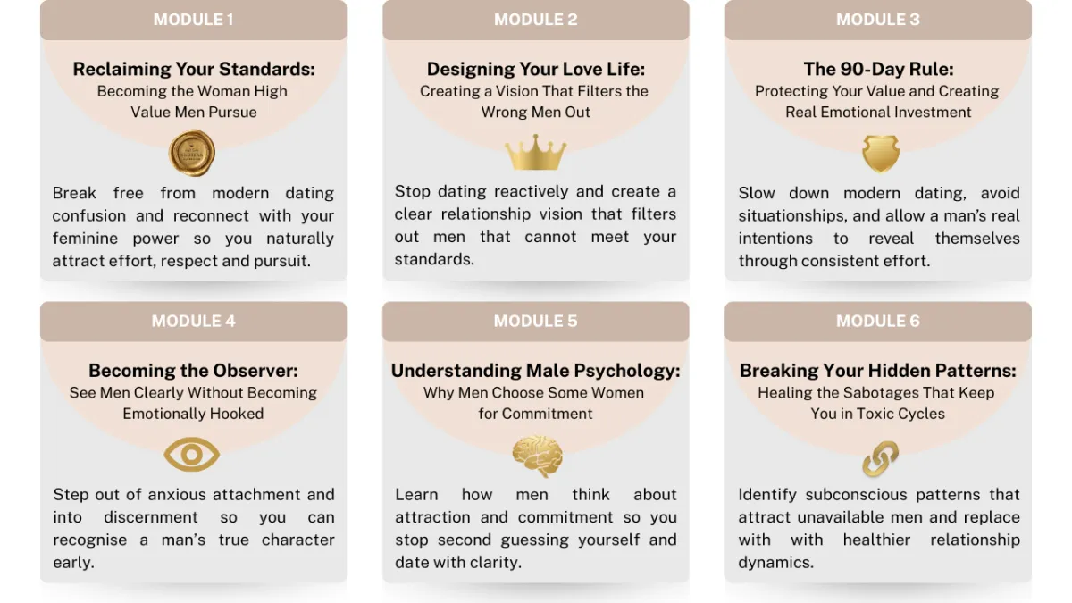 Many women unknowingly repeat patterns that attract avoidant or unavailable men. Inside the course you’ll learn how to identify those patterns and shift them so you start attracting men capable of real commitment.